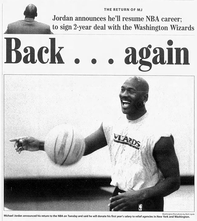 Retired in 1993. Came back in 1995. 3 lagi championships. 72-10 record season. Dan mencapai status GOAT – Greates of All Time. MJ comeback bukan sekadar average tetapi legendary kerana biasanya performance atlit, sukar untuk decline post-retirement.