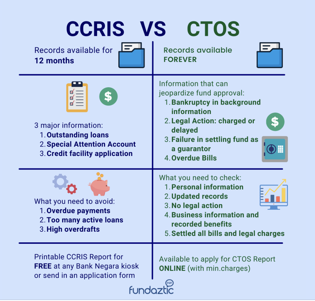 Manakala CTOS pula adalah informasi yang memberi idea hubungan kita dengan duit. Adakah kita seorang yang bankrupt? Atau kita dalam kes mahkamah?