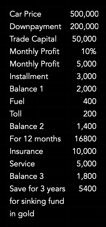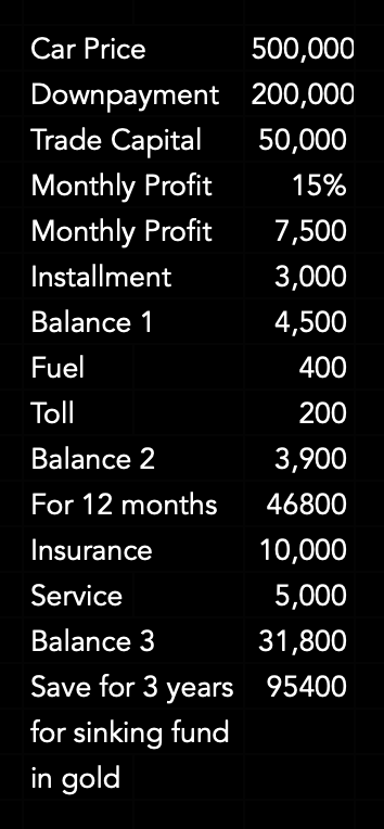 RM4K / 12, dalam RM333 sebulan. Ambil RM200 sebulan untuk tol, so ada balance RM133 atau lebih kurang RM1.6K lagi balance. (atau RM1.8K sebab RM200 ada dari lebihan minyak tadi). Ini kita beli emas dan simpan, cukup satu masa nanti (meaning 2-3 tahun), kalau nak tukar tayar 22 inch, kita dah ada sinking fund.