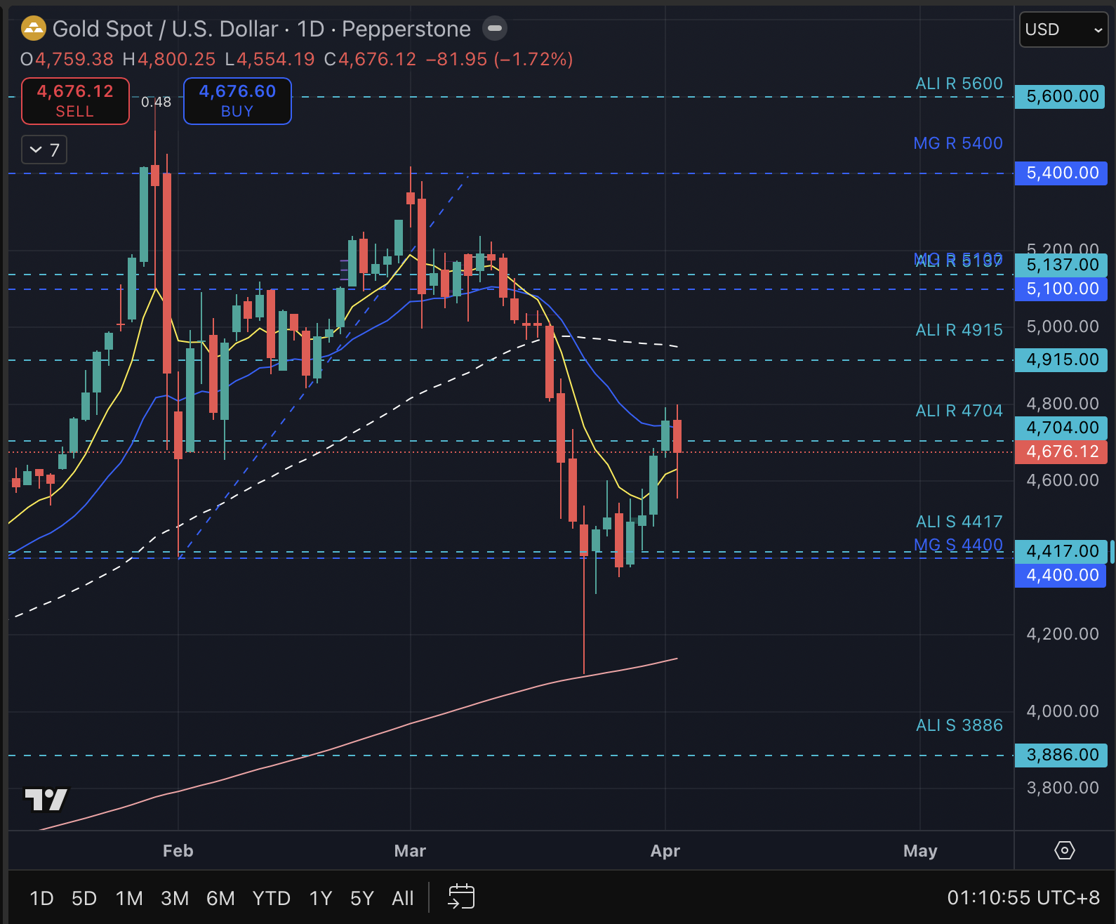 So kalau tengok chart terkaini, price naik ke $4704, namun closed bawah $4704, setakat ini. Price juga tak lepas 21 daily EMA biru tapi melepasi 8 daily EMA kuning. Maka, ini adalah correction, kalau tak lepas, jangkaan turun paling minimum $4417.