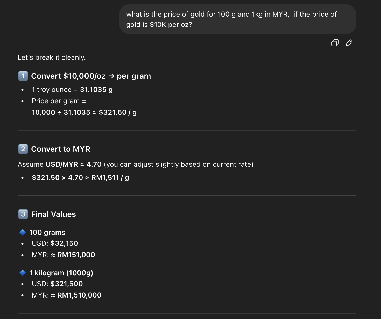 Bermodalkan RM64K untuk beli 100g gold bar, simpan, tunggu sampai gold naik $10K per oz, nilai 100g ini akan jadi RM150K, which is hampir 2.3X dalam masa 4-5 tahun.