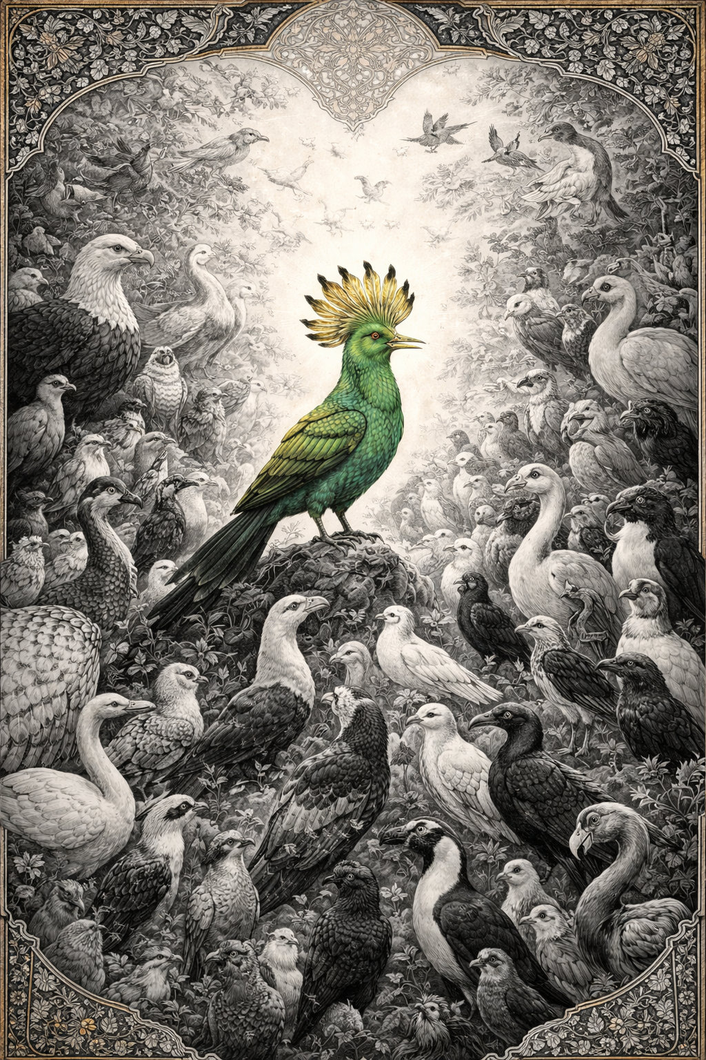 Ini adalah permulaan kisah kepada pengembaraan beratus ribu burung. Terbang, melepasi 7 lembah dimensi menuju Gunung Kaf, mencari raja yang bernama :